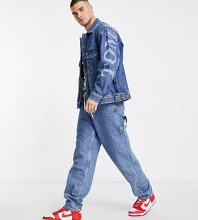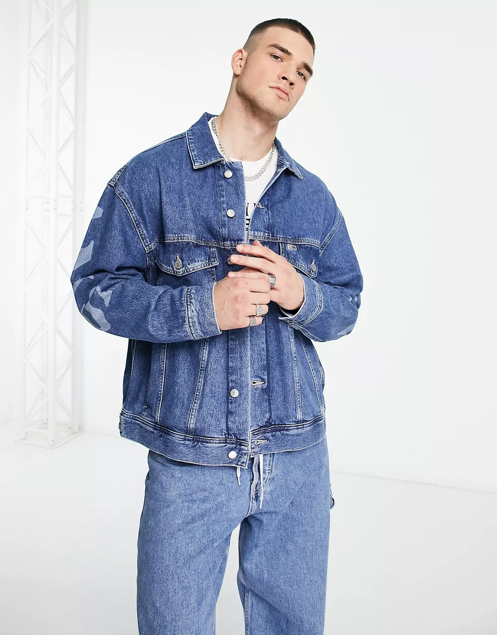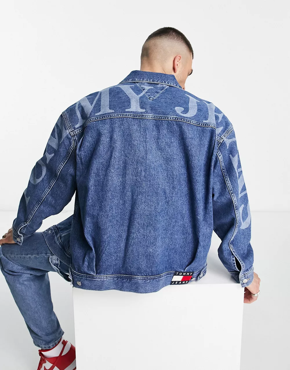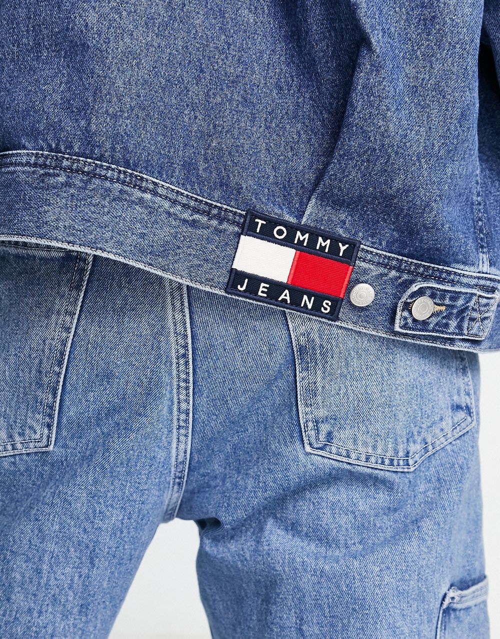 - Tommy Jeans arm logo oversized denim trucker jacket in mid wash