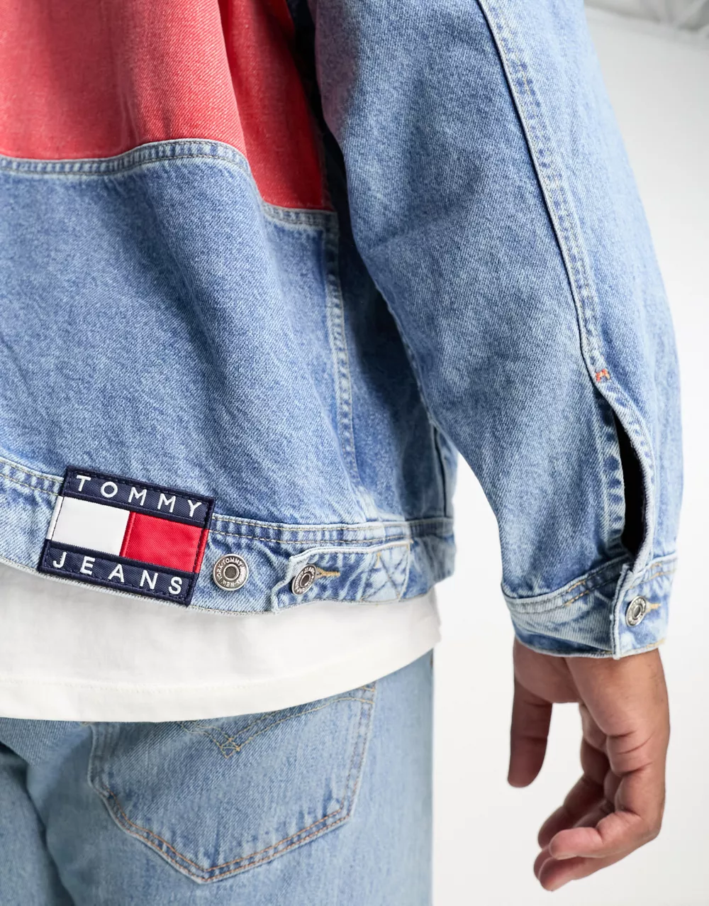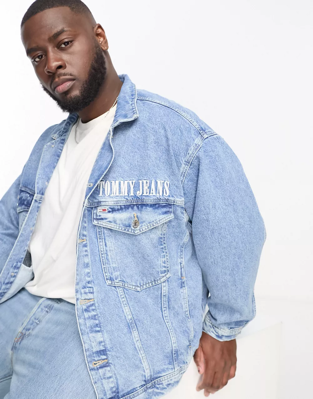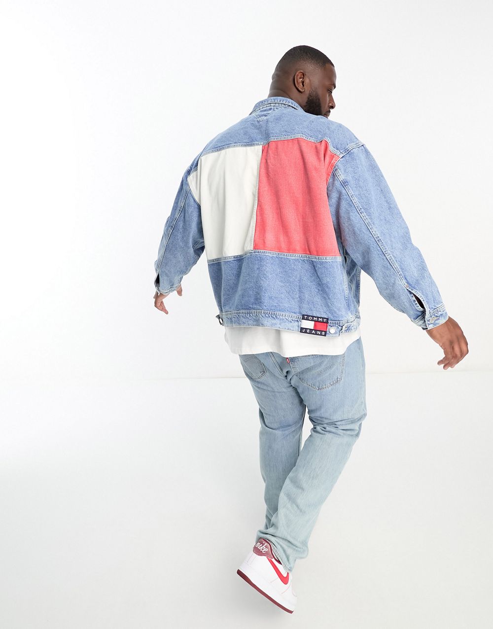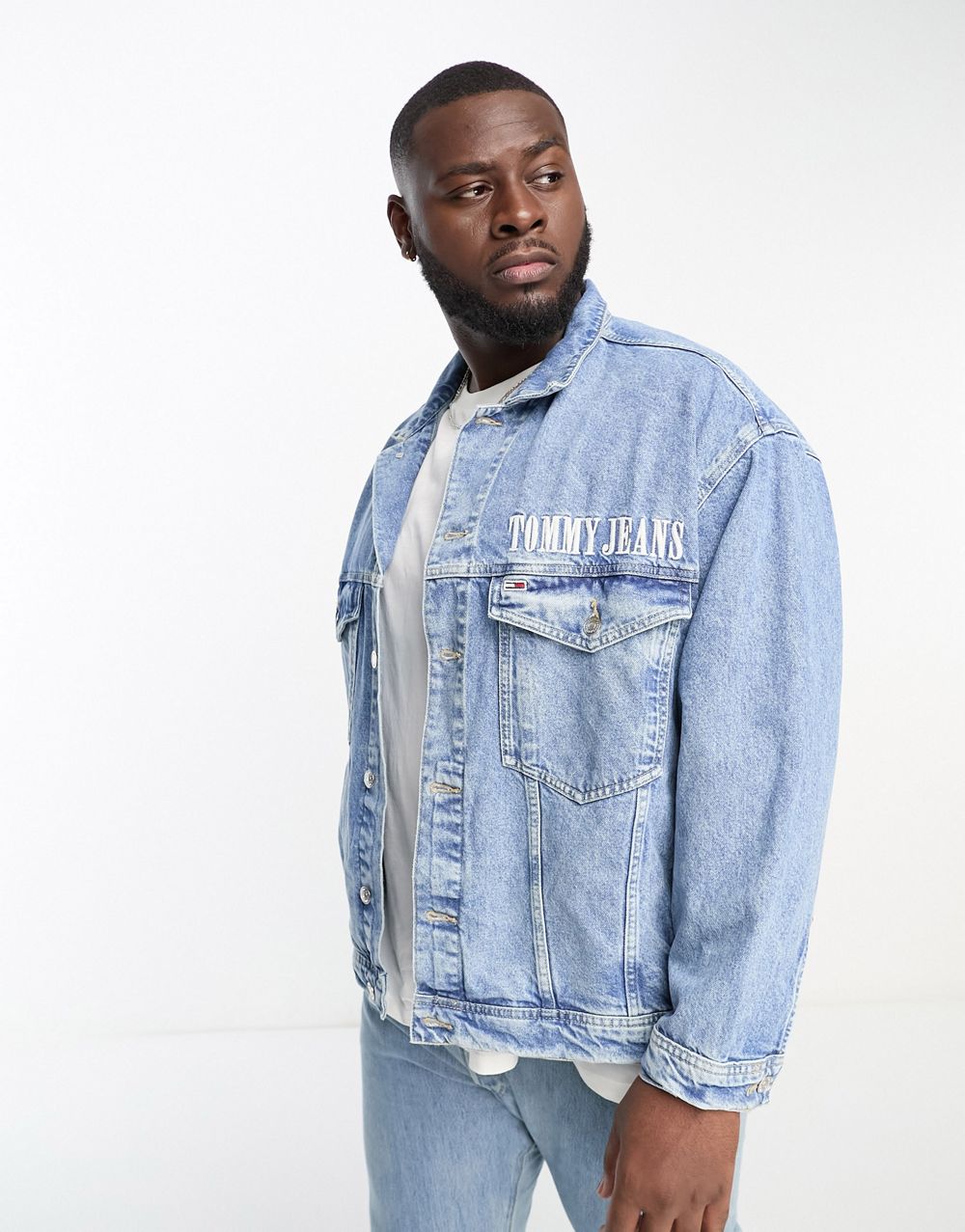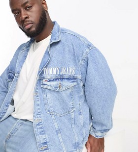 - Tommy Jeans Big & Tall cotton back flag oversized denim trucker jacket in light wash