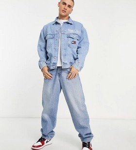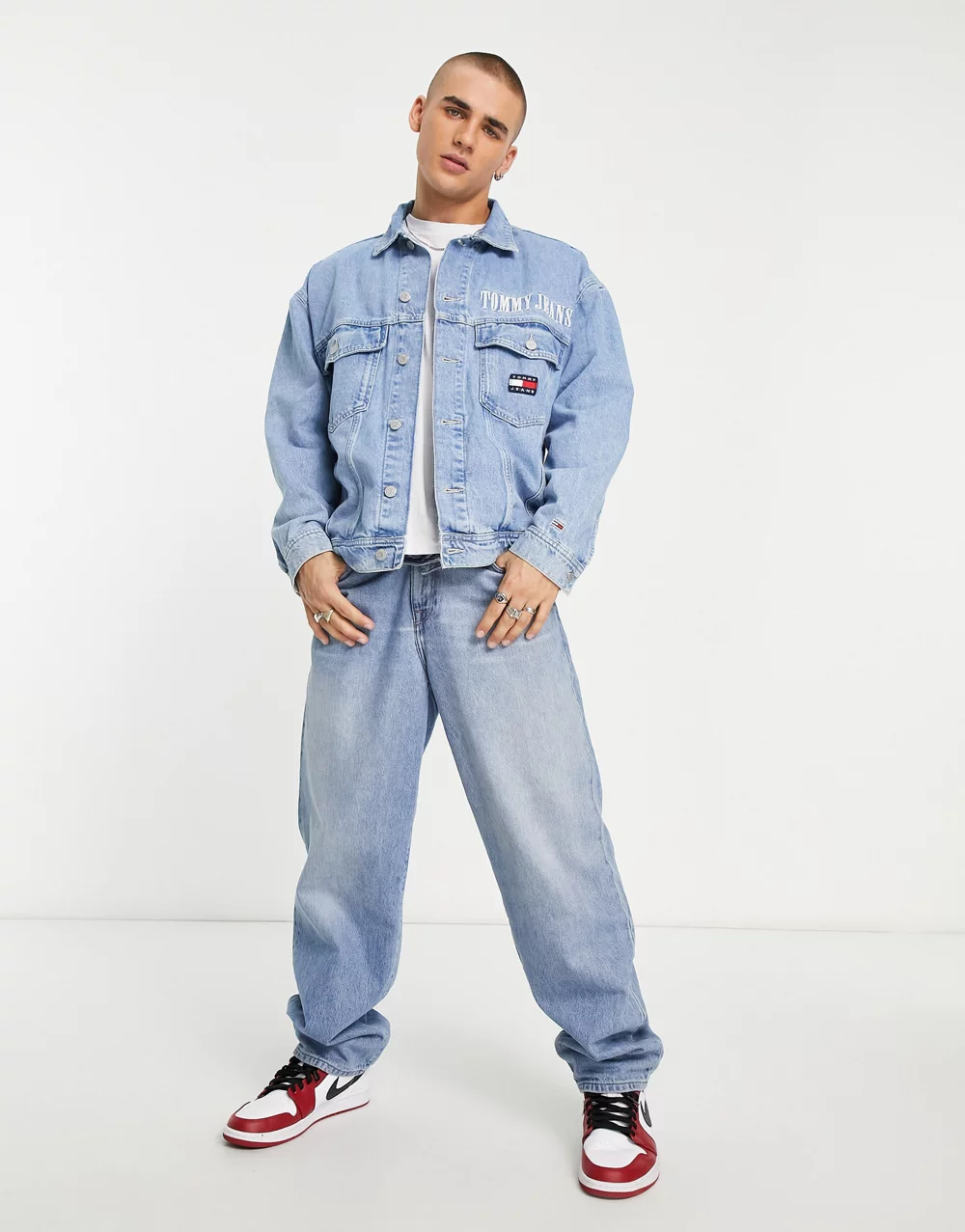 - Tommy Jeans cotton back flag oversized denim trucker jacket in light wash