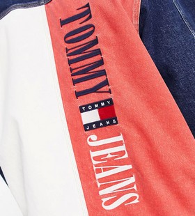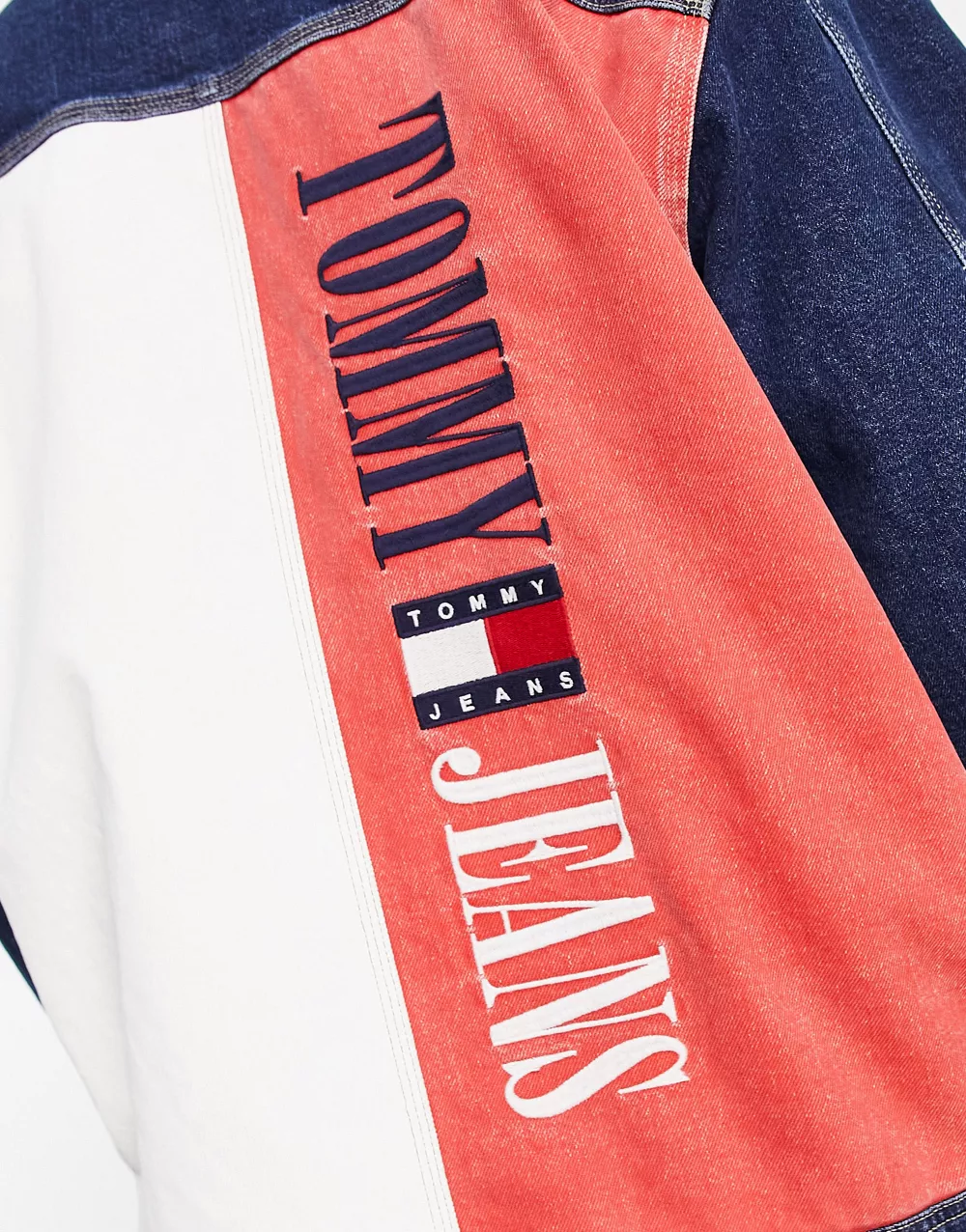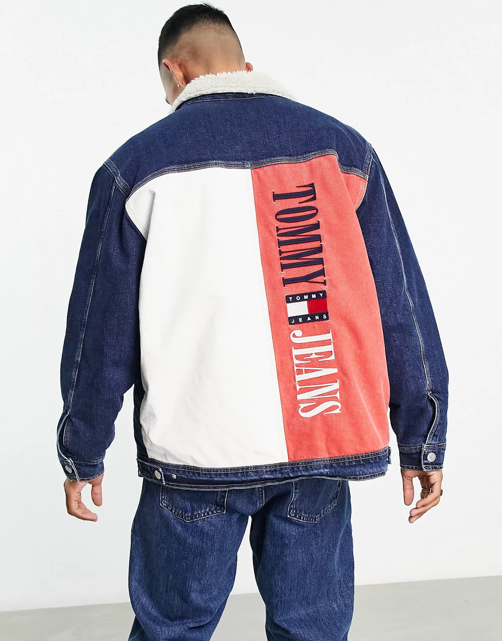 - Tommy Jeans cotton oversized archive back logo sherpa lined denim trucker jacket in dark wash
