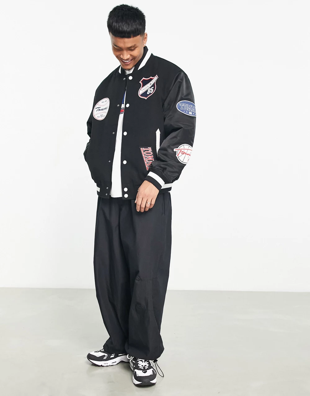 - Tommy Jeans varsity badge letterman bomber jacket in black